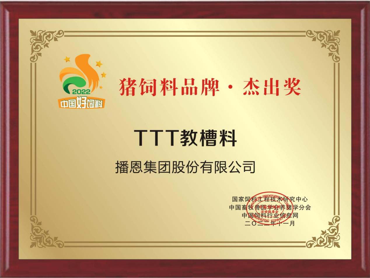 2022年12月3日,由中國(guó)飼料行業(yè)信息網(wǎng)主辦的“中國(guó)好飼料2022·頒獎(jiǎng)盛典”順利舉辦。播恩集團(tuán)“TTT教槽料”憑借自身的核心技術(shù),以及在教槽料市場(chǎng)上的優(yōu)異表現(xiàn),從眾多優(yōu)秀產(chǎn)品中脫穎而出,一舉獲評(píng)“豬飼料品牌·杰出獎(jiǎng)”!