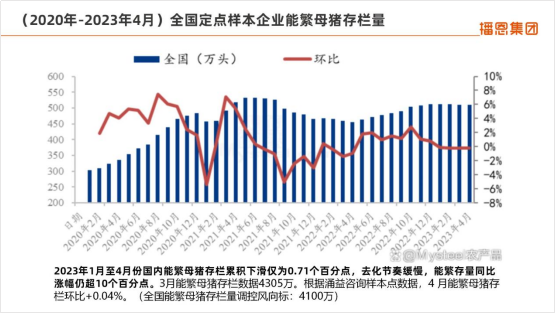 我國(guó)能繁母豬雖說(shuō)已連續(xù)4個(gè)月去化,但去化幅度僅有2.47%,4個(gè)月僅去化掉106萬(wàn)頭,4月末能繁母豬存欄依然高達(dá)4284萬(wàn)頭,超出正常保有量的104.5%。